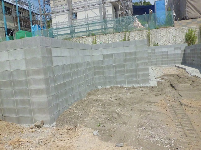 2mほど高低差がある敷地だったため、建物建築前に先行で土留めの型枠ブロック設置