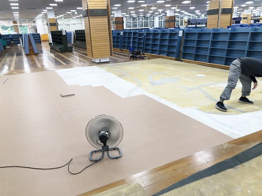 手配しました。既存のフローリング部分のワックスを剥離するため、いちど全ての本棚
