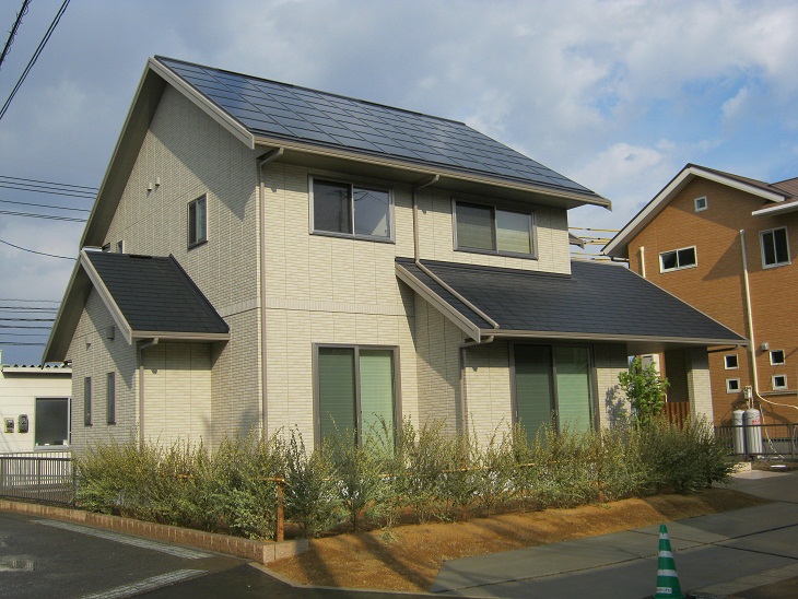 【大分市】外壁はアイボリー系のサイディング一色ですが、切妻の屋根のグレー色がきいており、アクセントになっています。