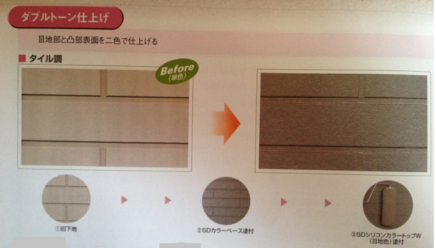 今回の塗装工事は、目地部と凸部表面を二色で仕上げるダブルトーン仕上げです。