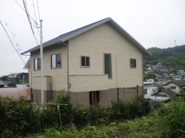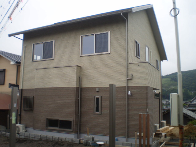 【大分県臼杵市S様邸 北面】1階と2階で同じブラウン系のサイディングを濃淡つけて貼り分けました。