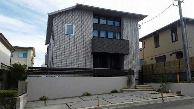 ベージュ系のタイル柄サイディングを建物全体に張り、凹凸部はブラウン系で