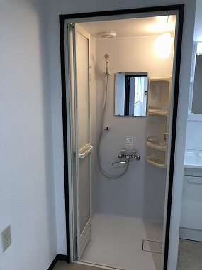 設備機器として、シャワールーム付洗面脱衣所を設置しました。内装工事では、
